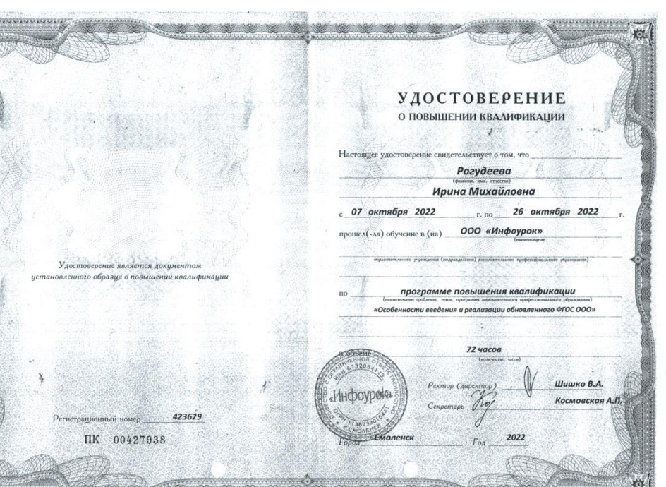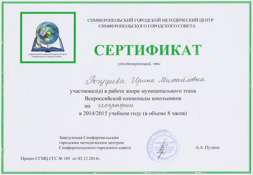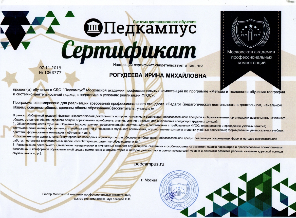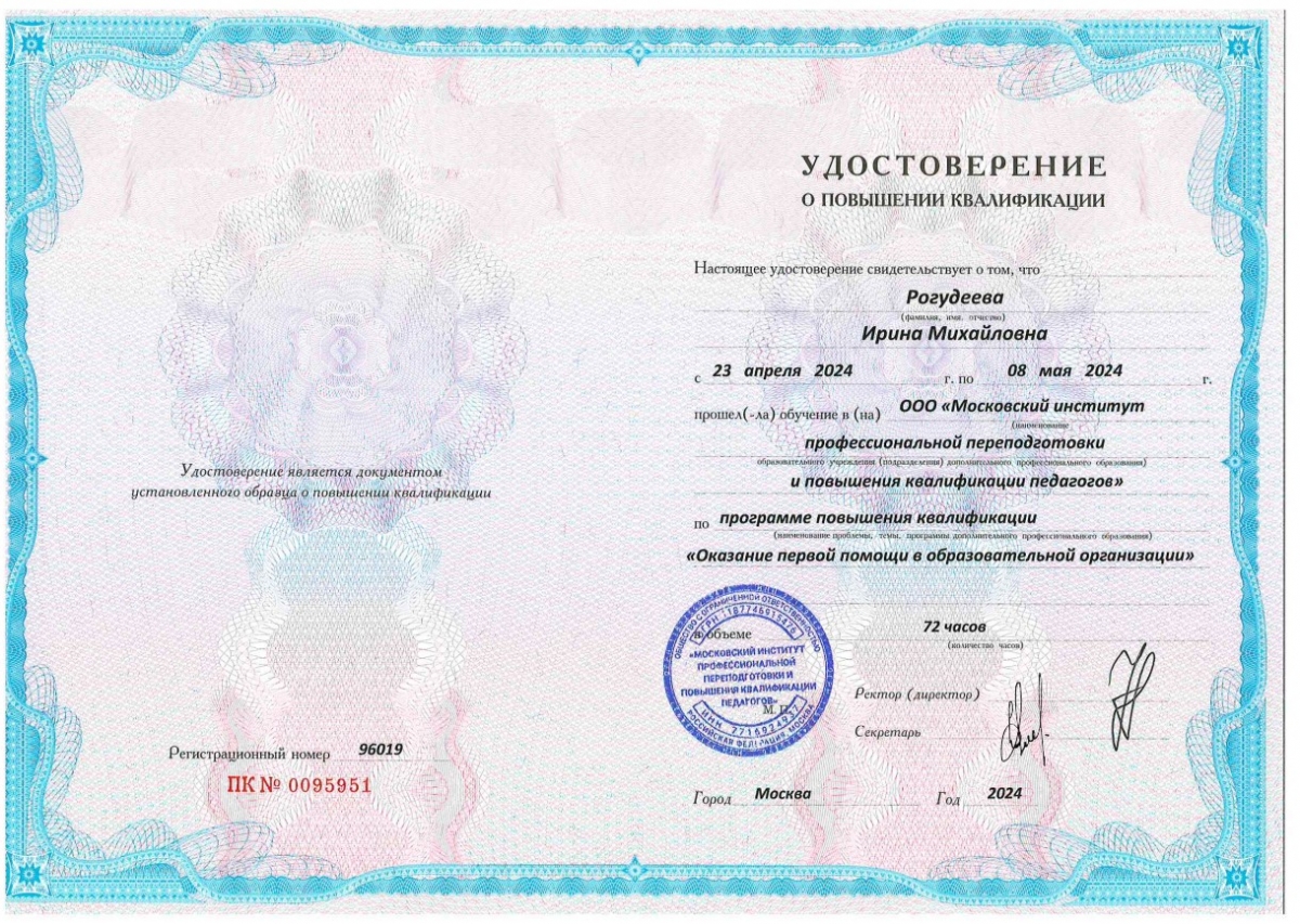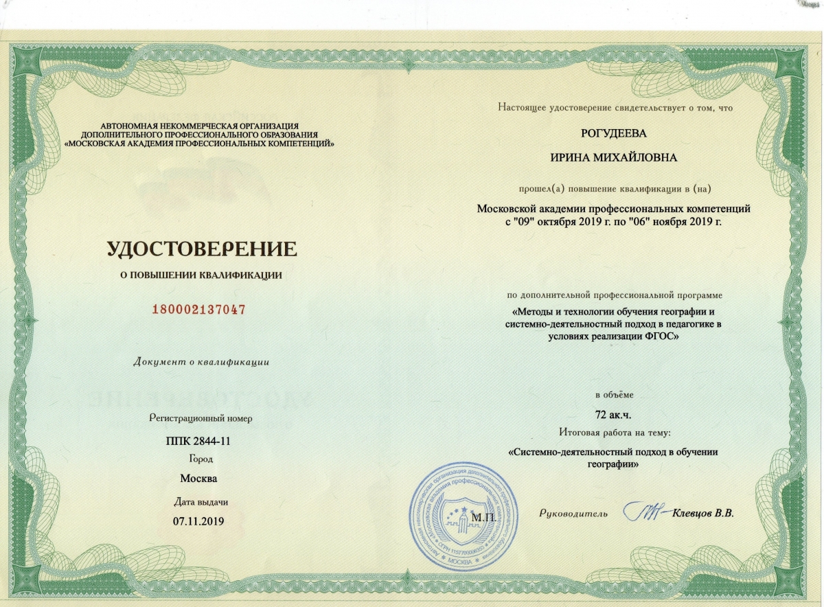 Повышение квалификации и/или переподготовка: ГБОУ ДПО КРИППО «Основы применения ИКТ в профессиональной деятельности педагога», 2021 г.; Московская академия профессиональных компетенций «Актуальные вопросы проектирования и осуществления образовательного процесса в условиях реализации ФГОС СОО», 2023 г.; г. Смоленск, ООО «ИНФОУРОК» «Формирование первичных компетенций использования территориального подхода как основы географического мышления с учетом ФГОС», 2023 г.; ООО «Московский институт профессиональной переподготовки и повышения квалификации педагогов» «Оказание первой помощи в образовательной организации», 2024 г.