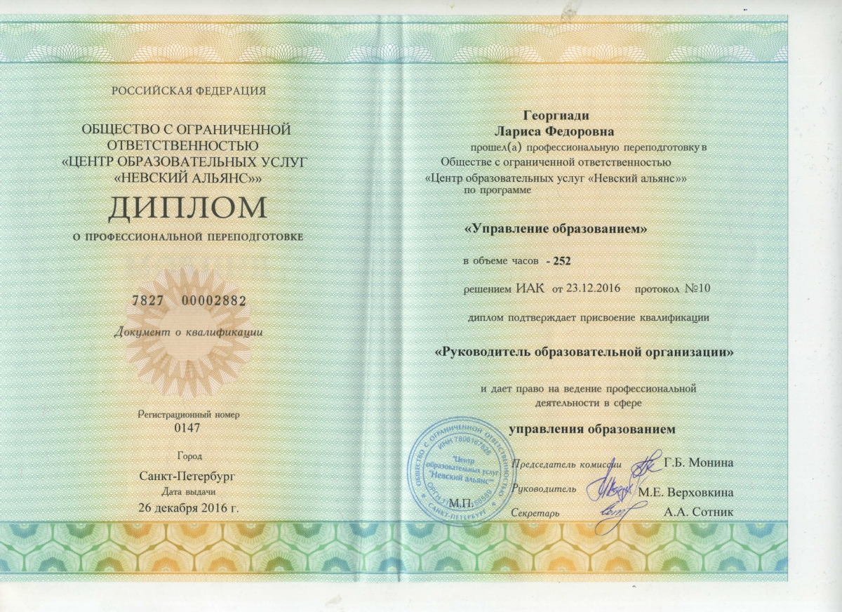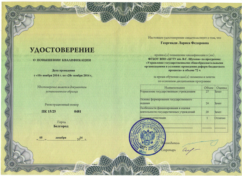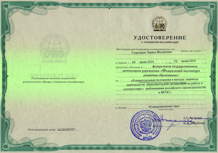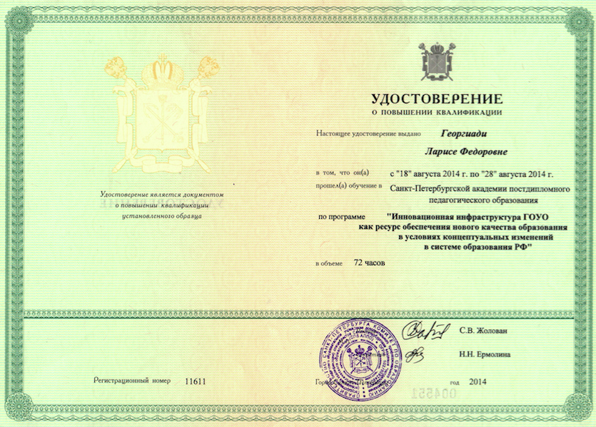 2023 г. Удостоверение о повышении квалификации по программе: «Педагог-психолог. Организация и содержание деятельности в условиях реализации ФГОС». Регистрационный номер RU 1 5505053275 23-29077-106601