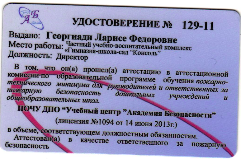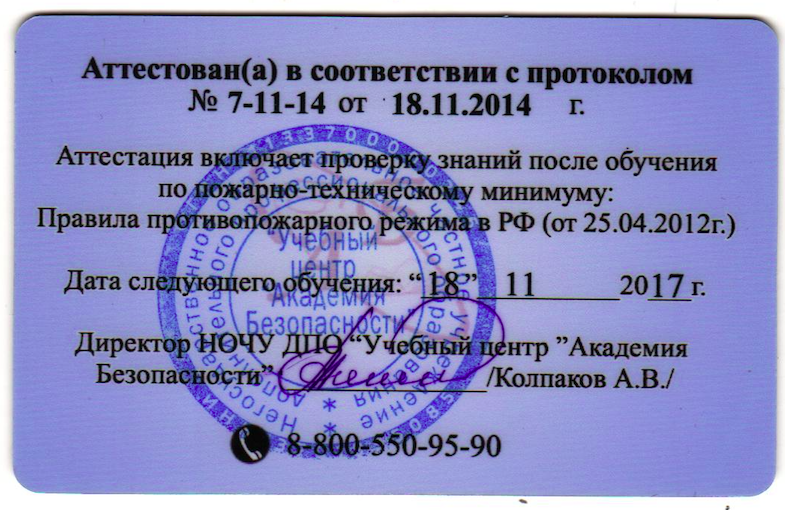 2023 г. Удостоверение о повышении квалификации по программе: «Дополнительная профессиональная программа повышения квалификации для ответственных должностных лиц, занимающих должности главных специалистов технического и производственного профиля, должностных лиц исполняющих их обязанности, на объектах защиты, в которых могут одновременно находиться 50 и более человек, объектах защиты, отнесенных к категориям повышенной взрывопожароопасности, взрывопожароопасности, пожароопасности». Регистрационный номер RU 1 5505053275 23-29077-106602