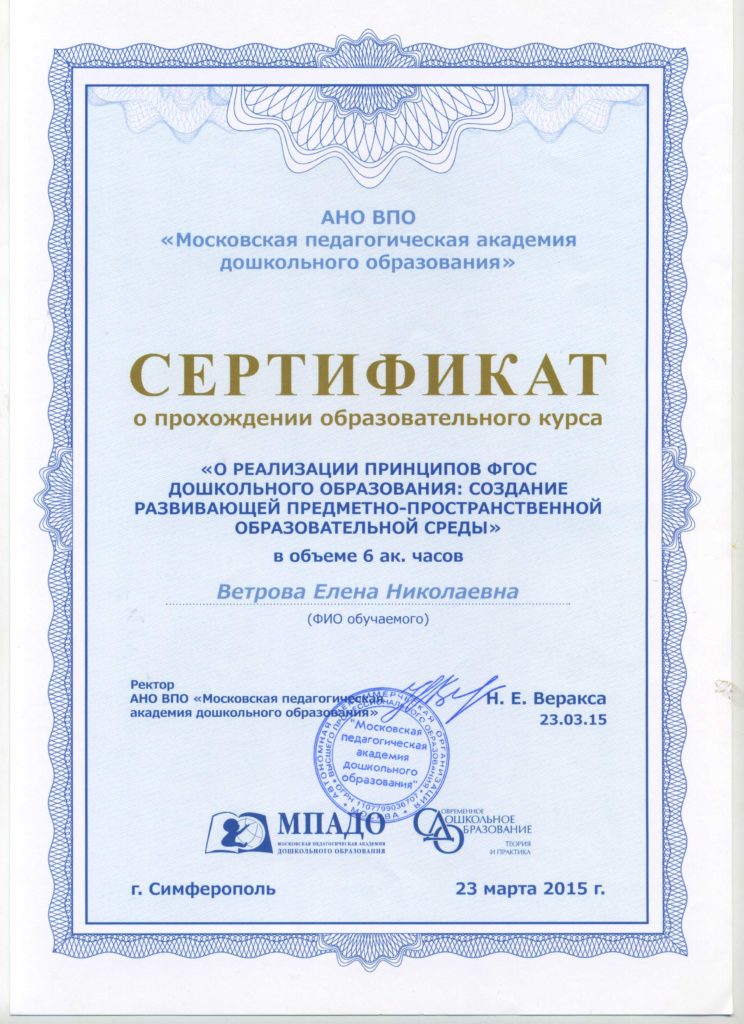 Образовательный курс «О реализации принципов ФГОС дошкольного образования: создание развивающей предметно-пространственной образовательной среды»