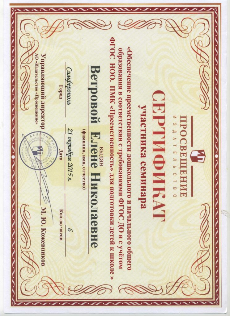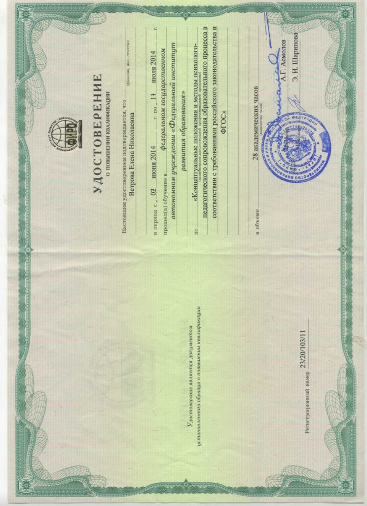 Курсы повышения квалификации в 2014 г. На базе федерального государственного автономного учреждения «Федеральный институт развития образования» по программе «Концептуальные положения и методы психолого-педагогического соправождения образовательного процесса в соответствии с требованием российского законодательства и ФГОС».